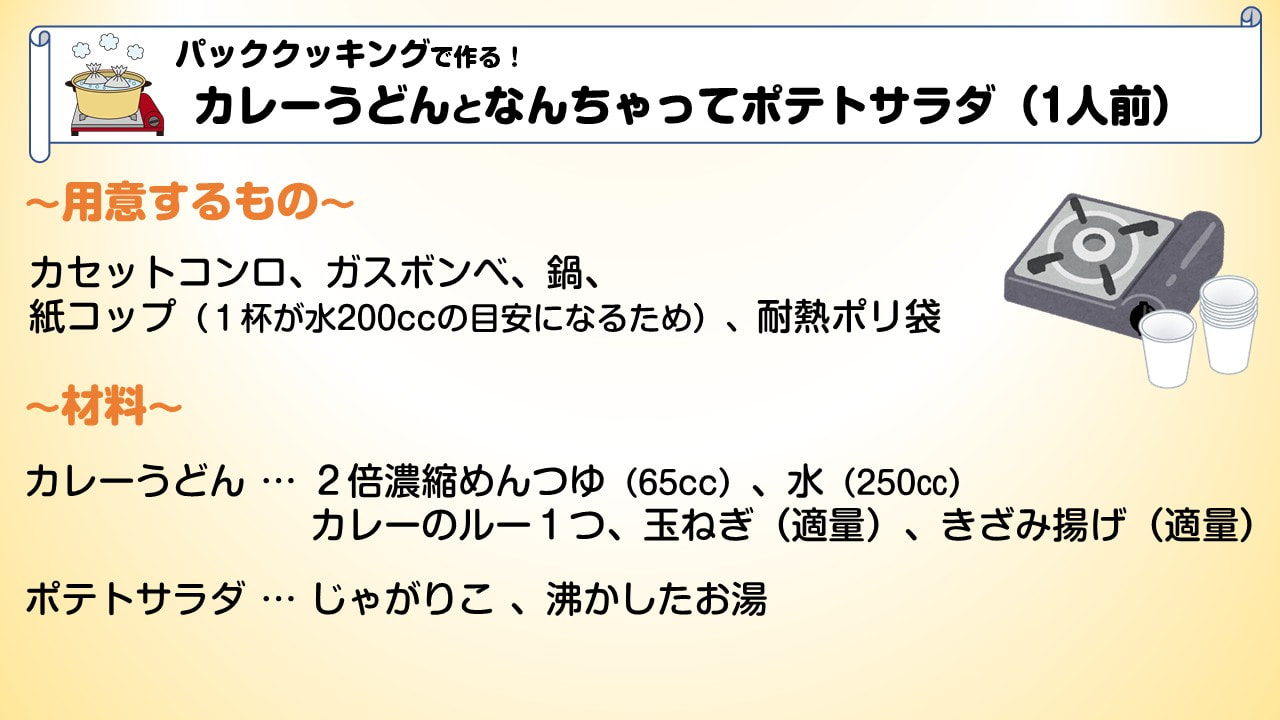 | 防災ごはん(パッククッキングで作るカレーうどん と なんちゃってポテトサラダ) |