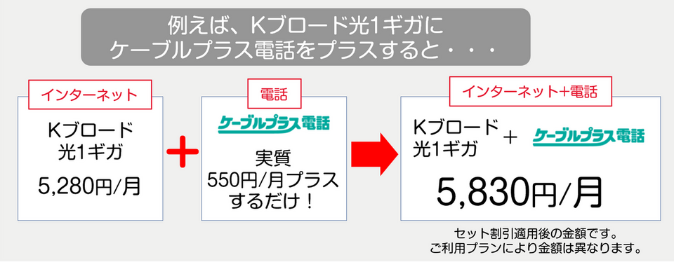 - Kブロード光1ギガをご利用で、ケーブルプラス電話にセットでご加入いただく際の実質プラス料金です。 ケーブルプラス電話の月額基本料金は1,639円です。