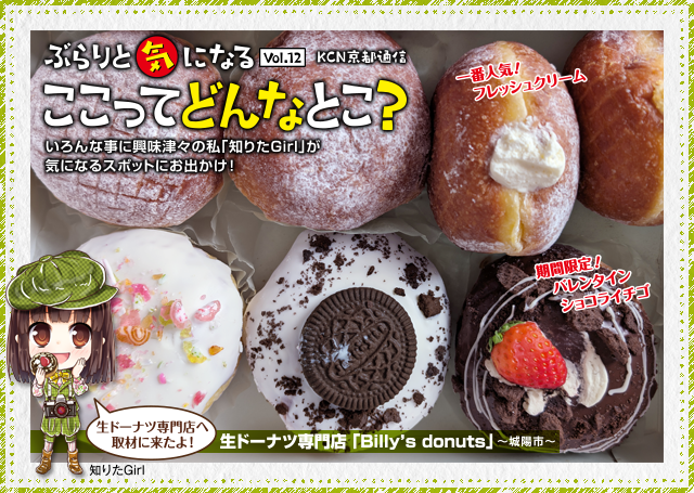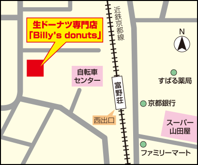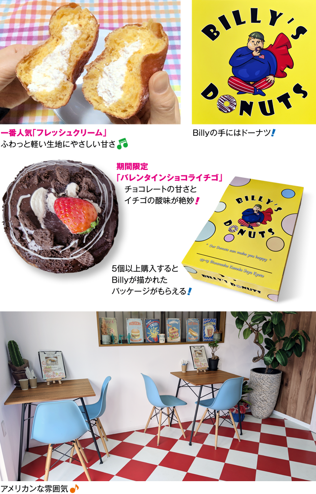 近鉄富野荘駅の近くに、生ドーナツの専門店があると聞き、さっそく訪れてみました。店内に入ると、カウンターにはヒーローの格好をしたキャラクターが描かれており、名前は「Billy」。